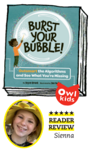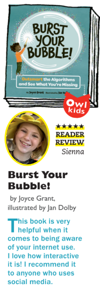 Thank you to Sienna, a kid-reviewer who gave Burst Your Bubble! five stars in a recent review in OWL magazine. (Disclosure: Burst Your Bubble! was published by Owlkids Books, which also publishes OWL magazine.)